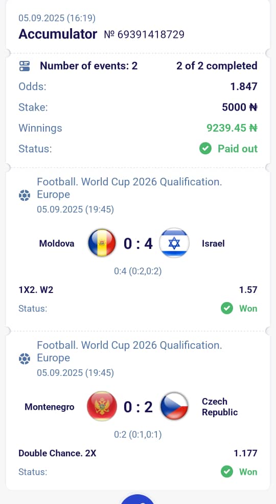 WC | Montenegro VS Czechia | X2 | 0 : 2 |