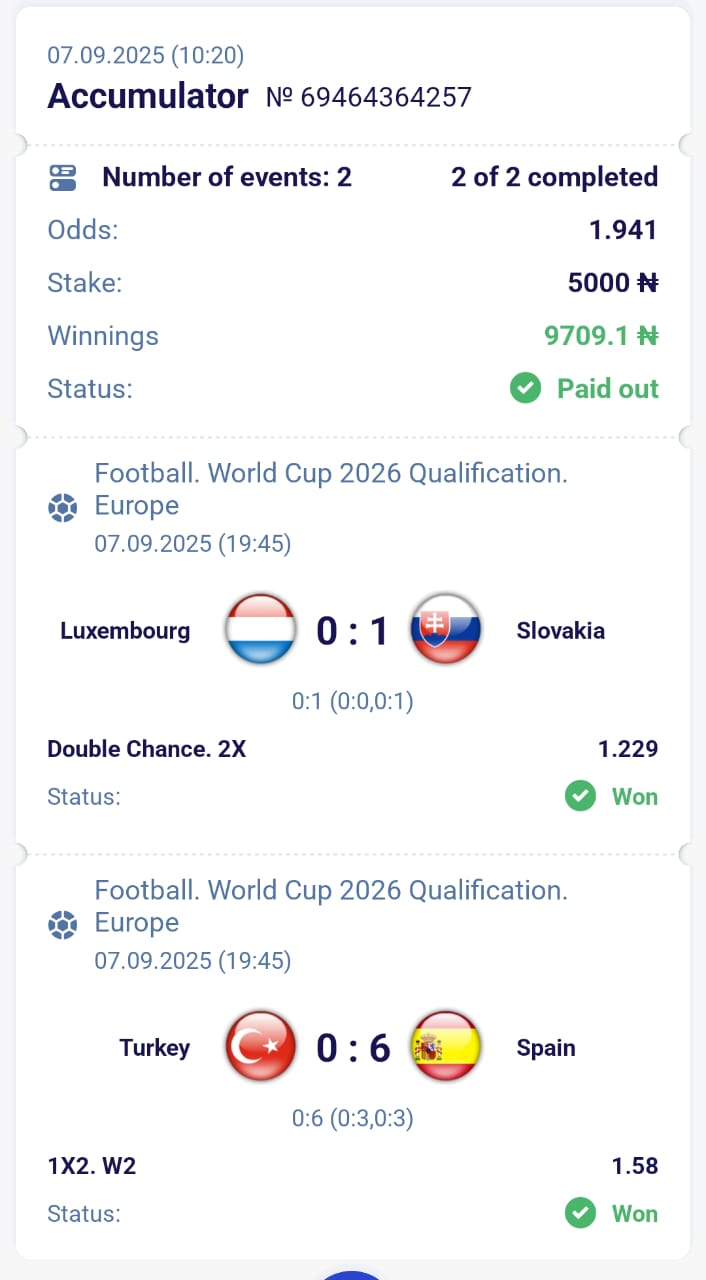WC | Luxembourg VS Slovakia | x2 | 0 : 1 |