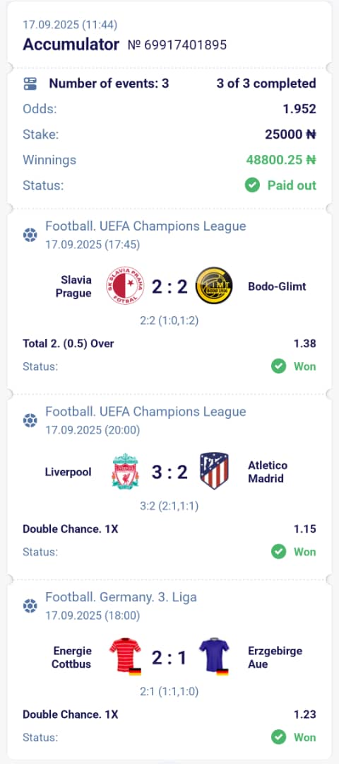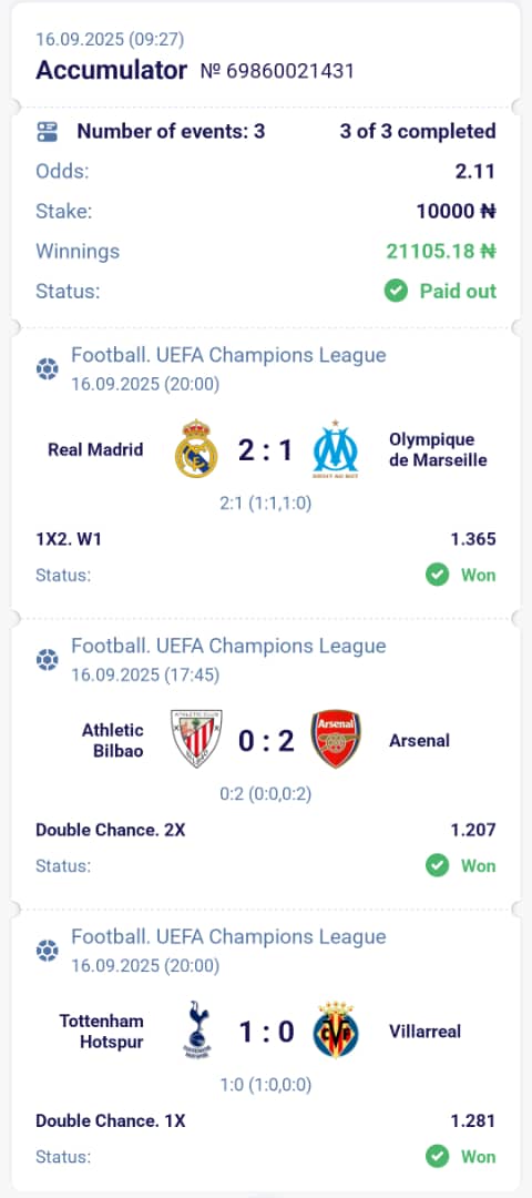 | UCL | Bilbao VS Arsenal | x2 | 0 : 2 |