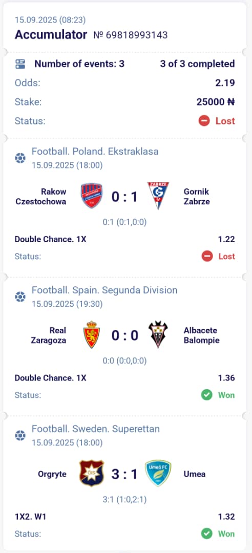 | POL | Czestochowa VS Gornik Zabrze | 1x | 0 : 1 |