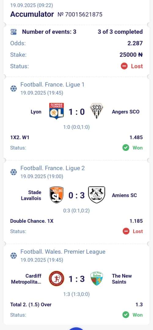 | FRA 2 | Stade Lavallois VS Amiens | 1x | 0 : 3 |