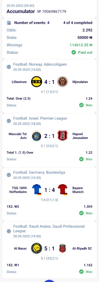 | ISR | Maccabi Tel Aviv FC VS Maccabi Netanya FC | ov 1.5 | 4 : 0 |