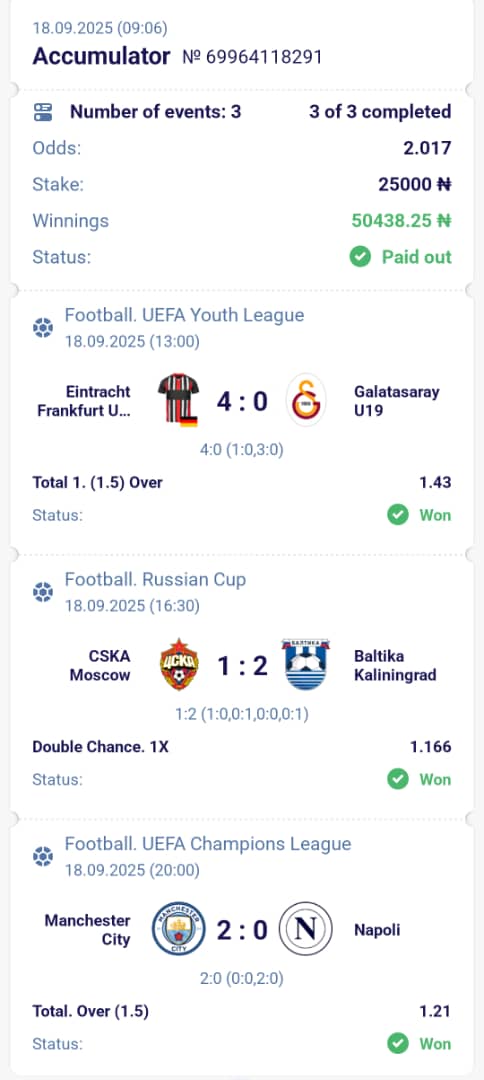 | UCL U19 | Eintracht Frankf U19 VS Galatasaray U19 | Home ov 1.5 | 4 : 0 |