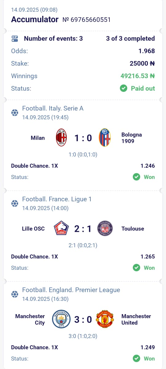 | EPL | Manchester City VS Manchester Utd | 1x | 3 : 0 |