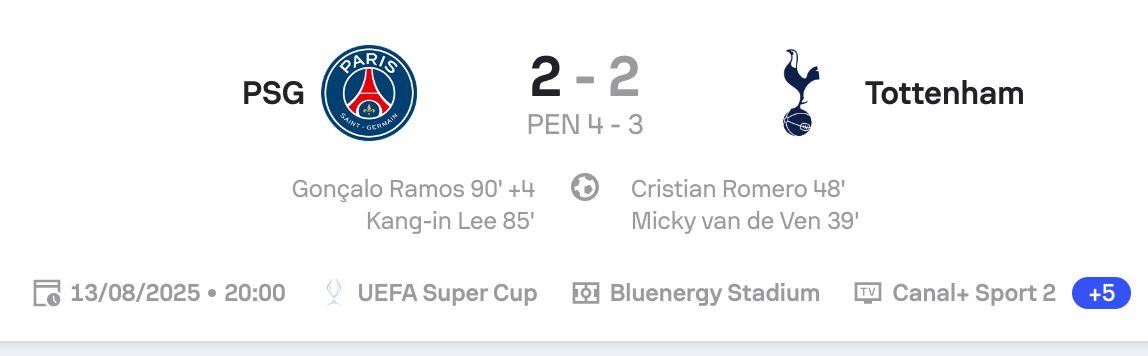 | UEFA Super Cup | PSG VS Tottenham | 1 | 2 : 2 |