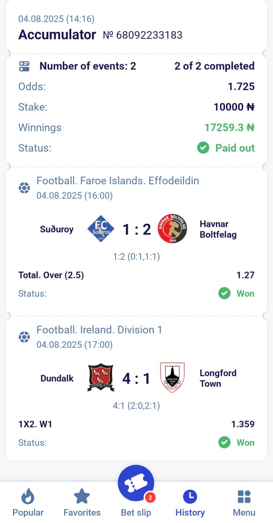 | Faroe PL | FC Suduroy VS HB Torshavn | OV 2.5 | 1 : 2 |