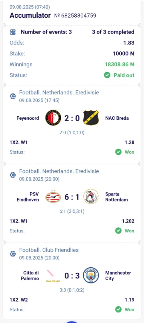 | NED | PSV VS Sparta Rotterdam | 1 | 6 : 1 |