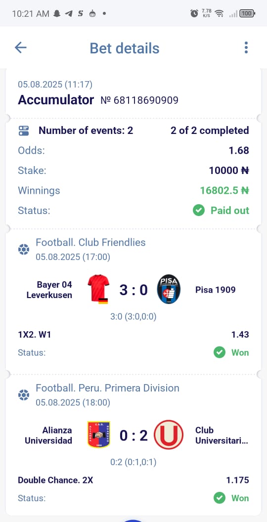 | INT | Bayer Leverkusen VS SC Pisa | 1 | 3 : 0 |