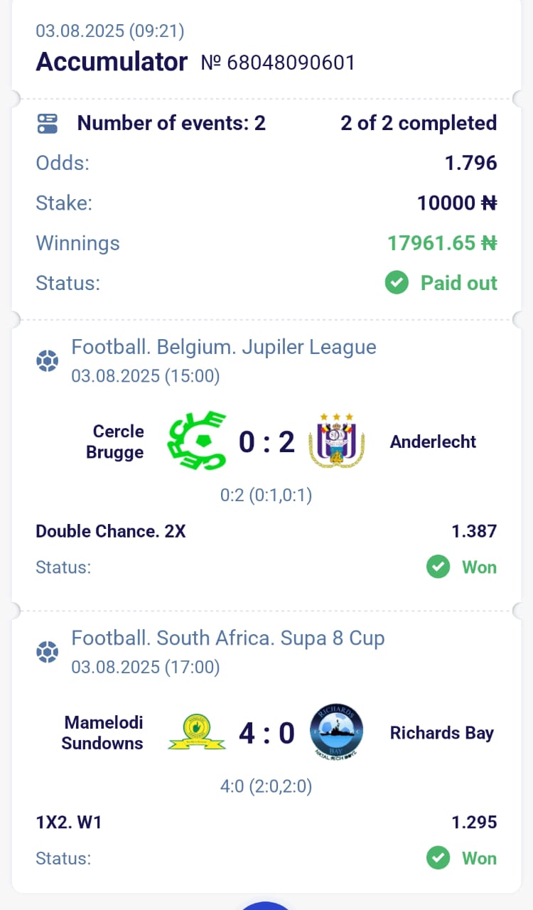 | BELG | Cercle Brugge VS Anderlecht | x2 | 0 : 2 |