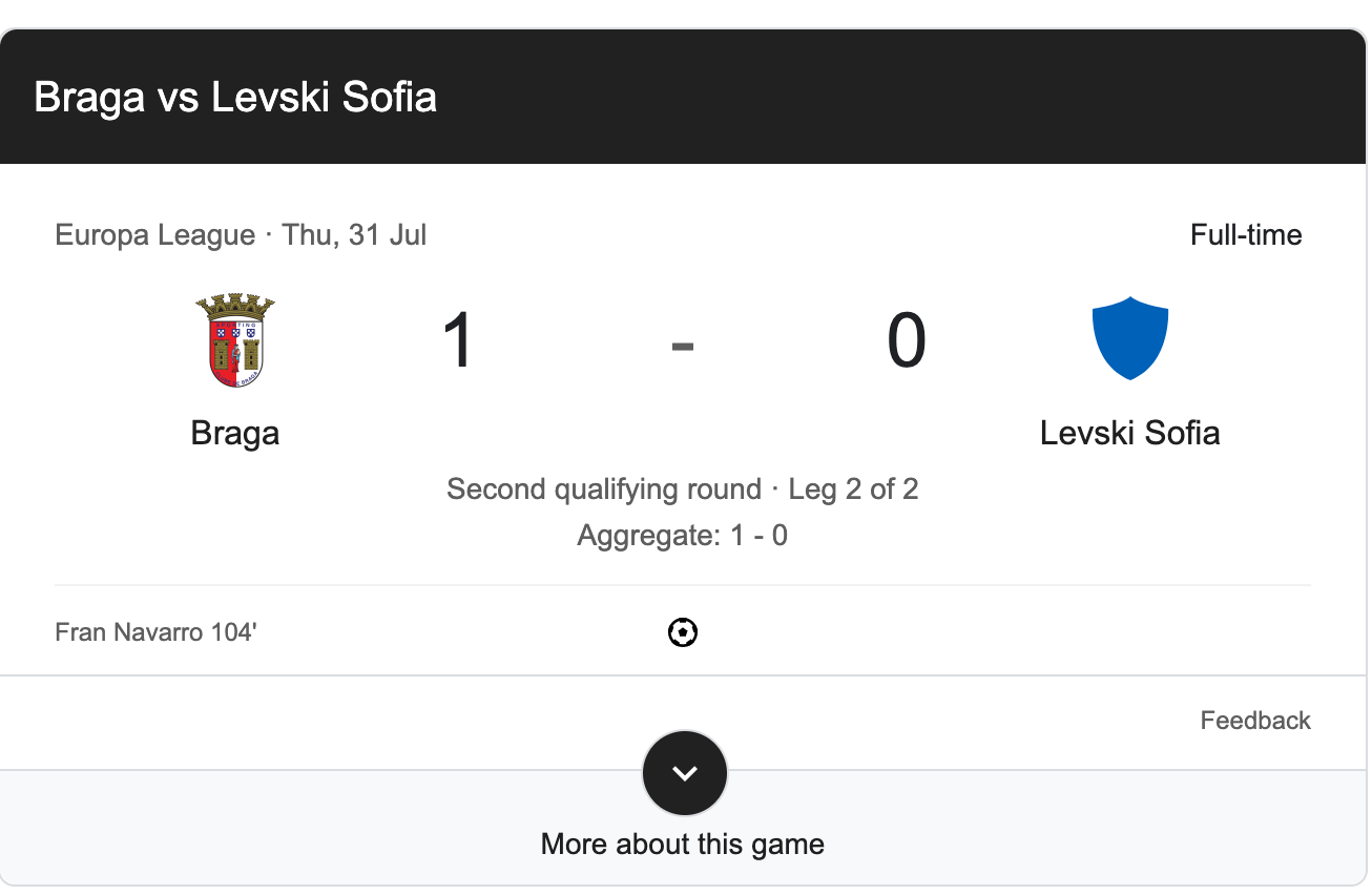 | UEL | Braga VS PFC Levski Sofia | 1 | 0 : 0 |