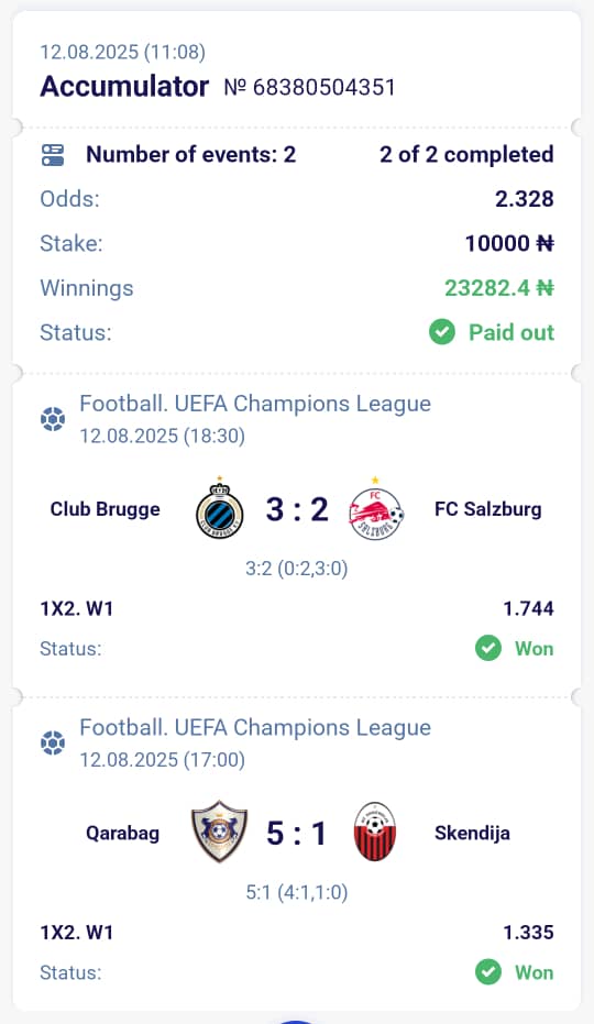 | UCL | Qarabag VS Skendija | 1 | 5 : 1 |