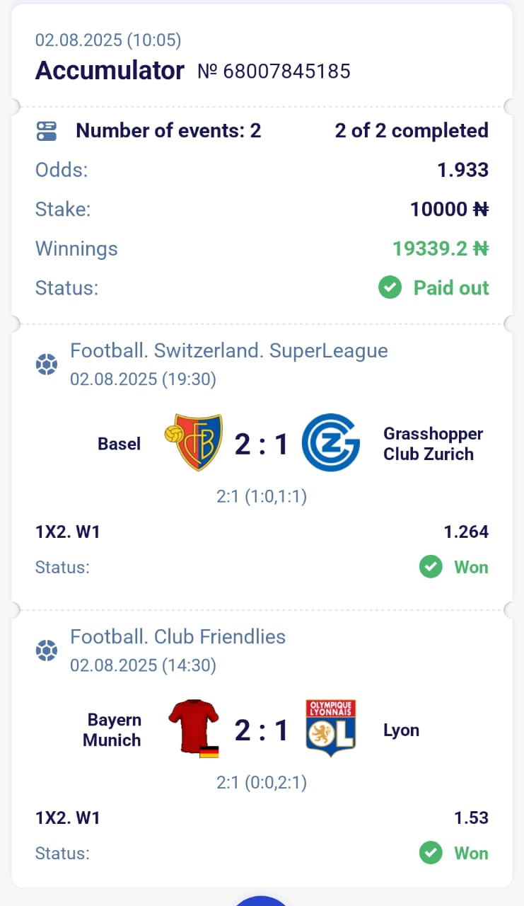 | INT | Bayern Munich VS Lyon | 1 | 2 : 1 |