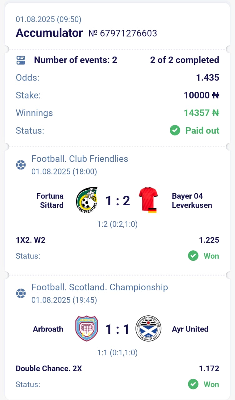 | SCO | Arbroath VS Ayr Utd | ov 1.5 | 1 : 1 |